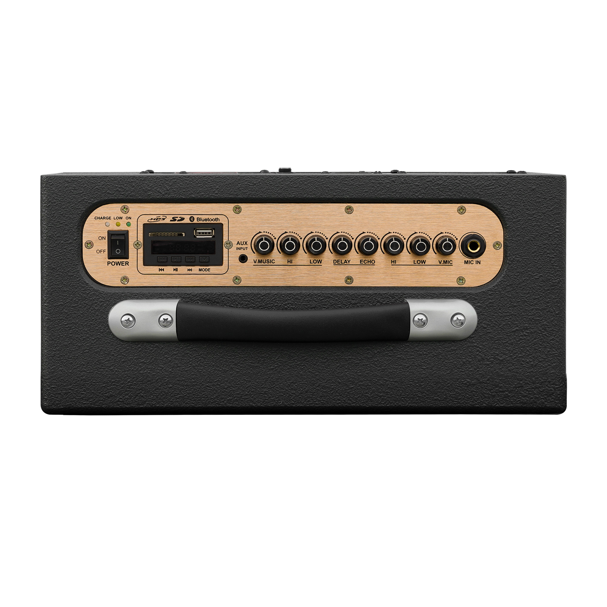 Điều chỉnh cho micro gồm 3 nút: V.MIC, HI và LOW (âm lượng, treble, bass)