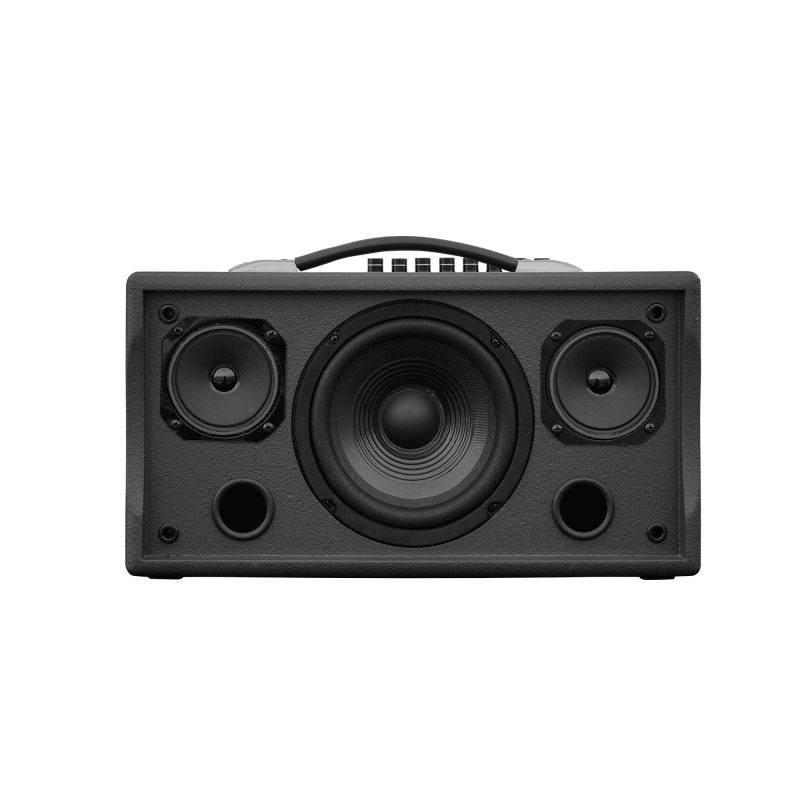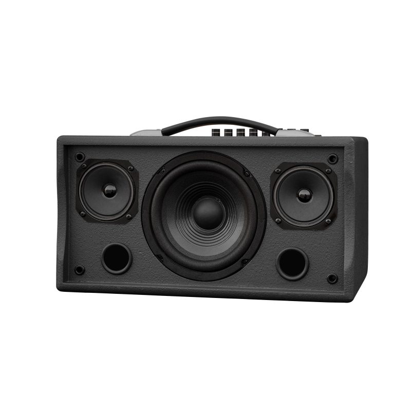 Chất liệu thùng loa làm bằng gỗ và được sơn nước ba lớp, sơn nhám và vân đá nổi tạo cho loa sự cứng cáp , năng động và cá tính. Màn lưới che loa được làm từ vải mềm với họa tiết sọc caro màu xám đẹp mắt và mềm mại. Loa được gắn tay xách bằng nhôm chắc chắn nên dễ dàng di chuyển hay cần thay đổi vị trí đặt loa. Thiết kế tối giản với kích thước: (39×21,5×21,5) cm và trọng lượng 10 kg nên việc di chuyển mang theo chiếc loa rất thuận tiện